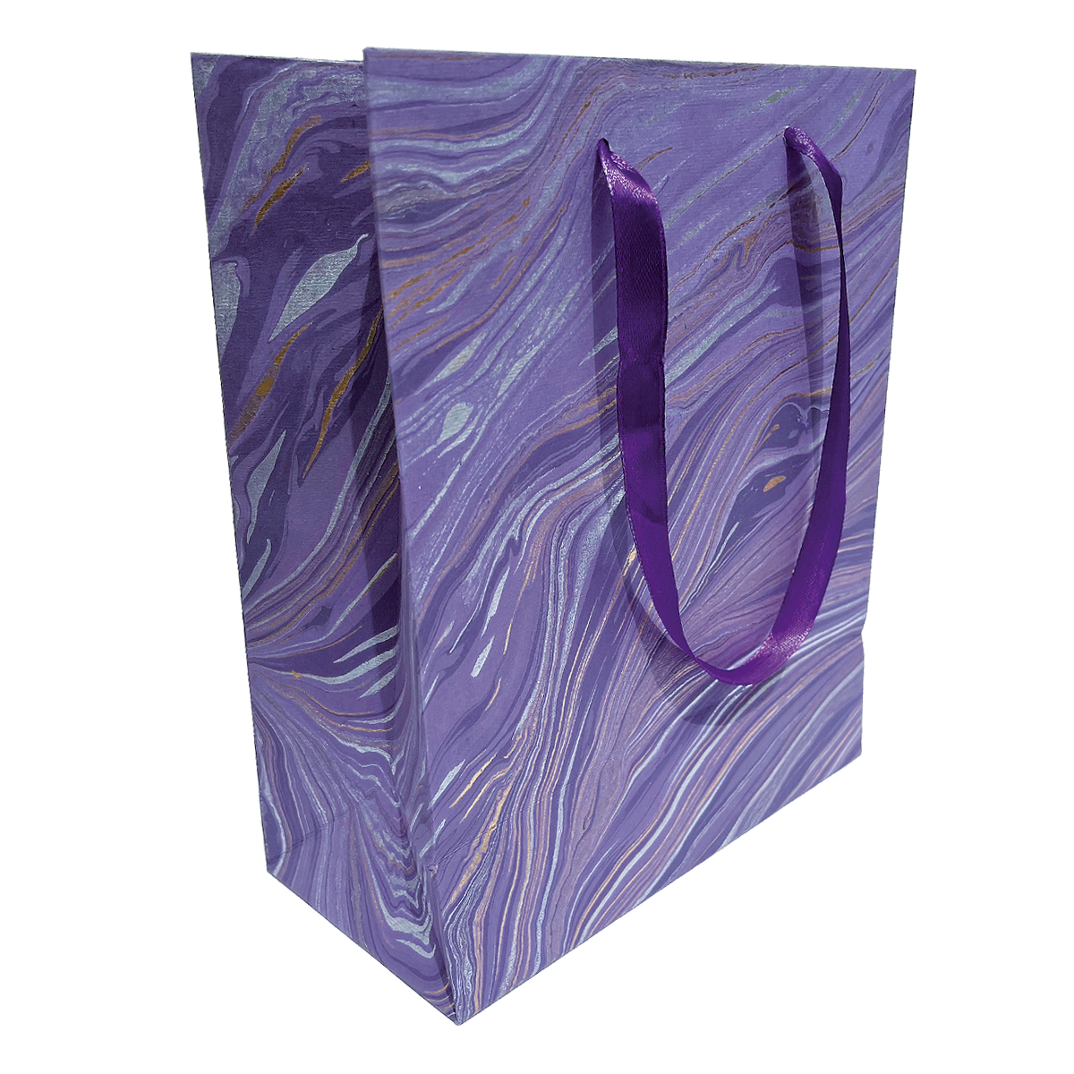 Geschenktasche, medium Marmoriert aus handgeschöpftem Papier in Violett/Gold.