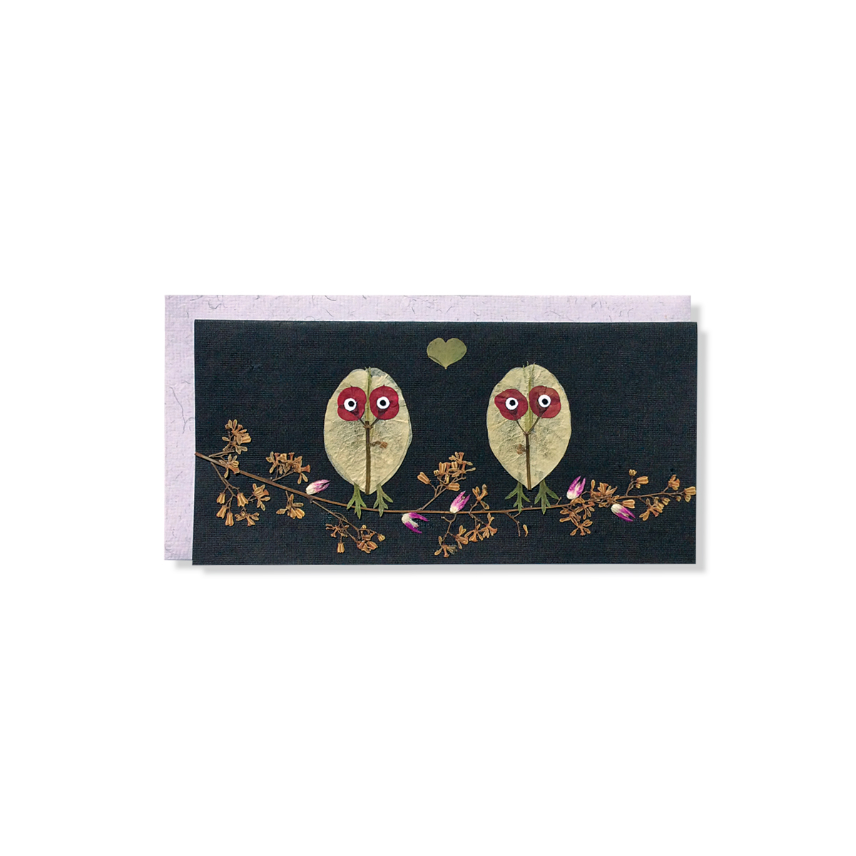 Diese Tier-Grußkarte zeigt zwei Eulen aus echten Blüten und Gräsern.