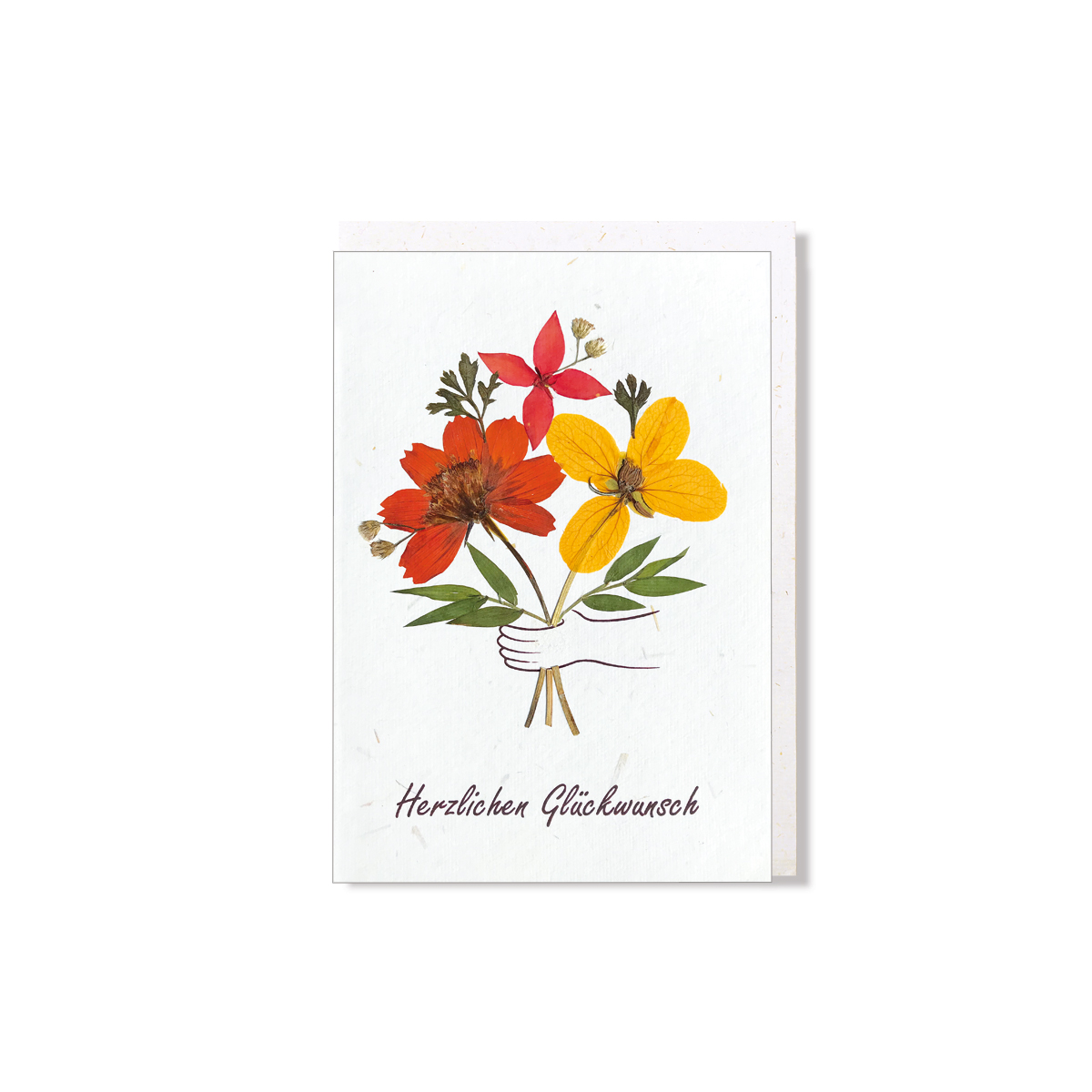 Grußkarte zum Geburtstag mit einer Hand, die einen üppigen Blumenstrauß hält.