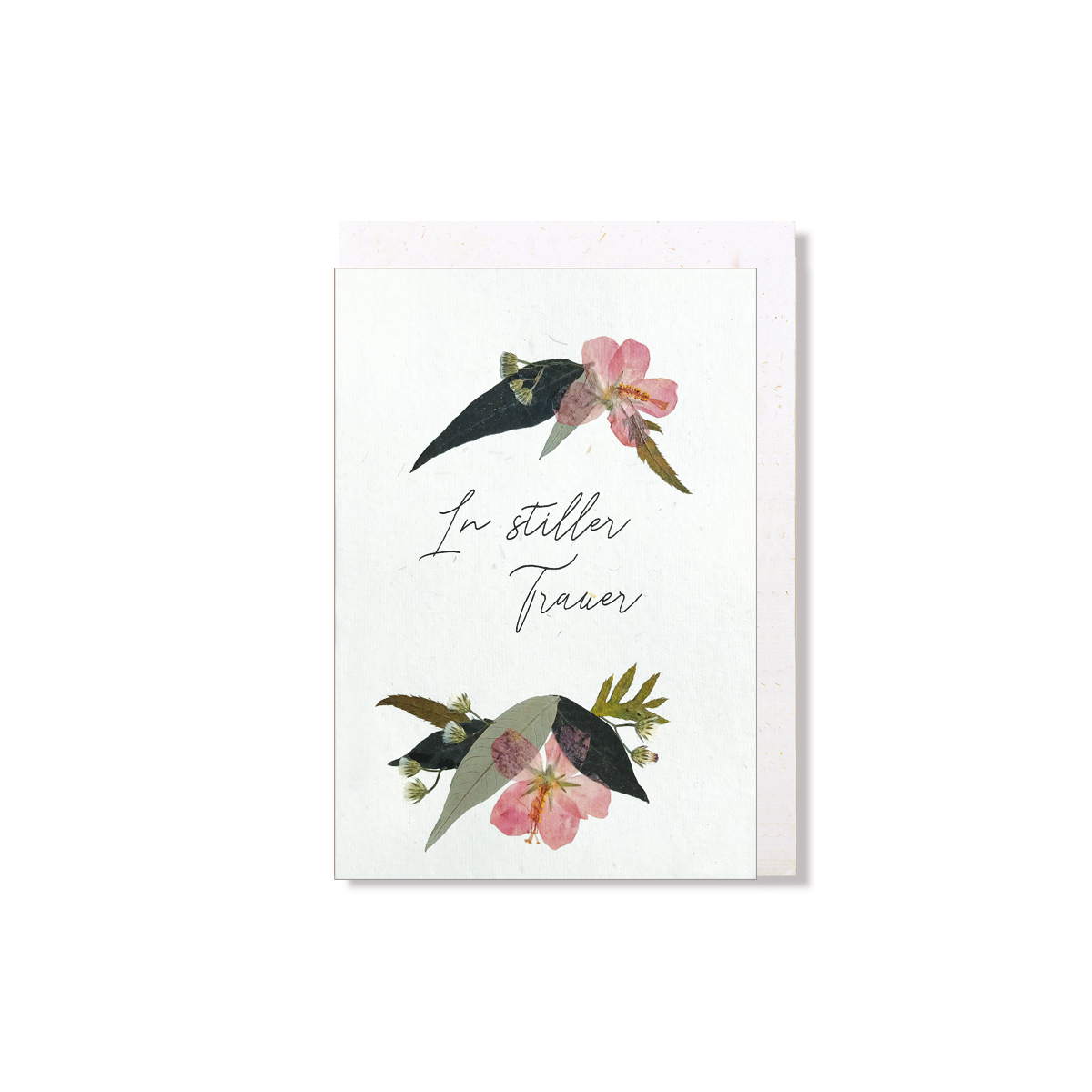 Trauermotiv mit Blumendekoration und dem Text In stiller Trauer.