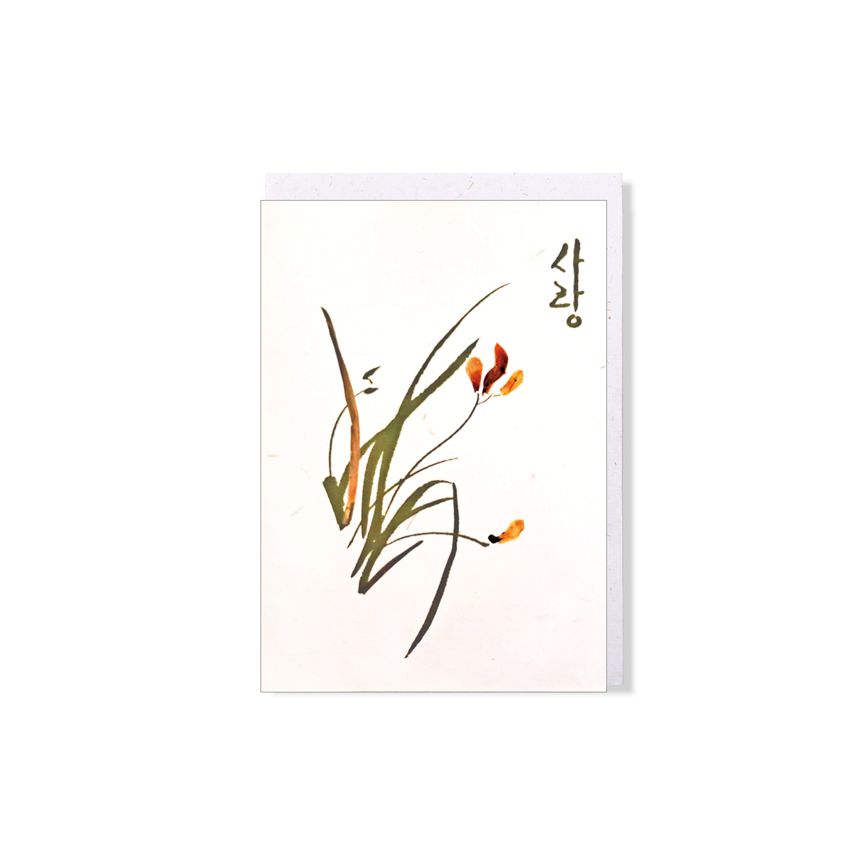 Das elegante Grußkartenmotiv aus echten Gräsern und Blütenblättern ist für jeden Anlass passend. Das koreanische Schriftzeichen in der rechten oberen Ecke bedeutet Liebe. (Übersetzung auf der Rückseite)