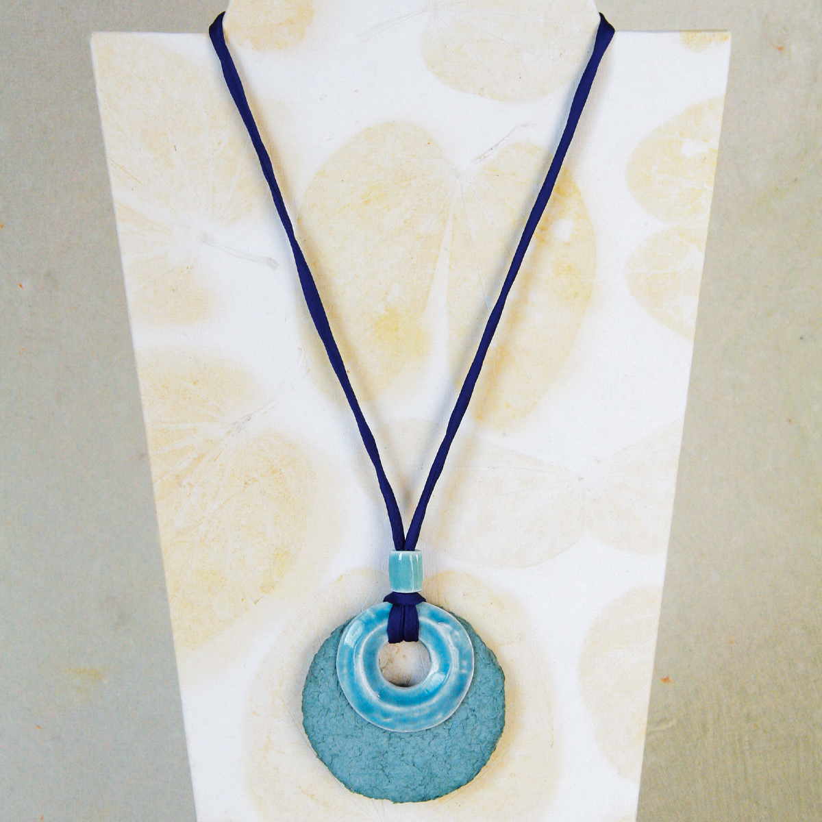 Farbenprächtige verstellbare Halskette Esha in feinem Ozeanblau. Ein toller Hingucker mit einem Anhänger aus stabilem handgeschöpftem Papiermaché und bemalten Keramikperlen.