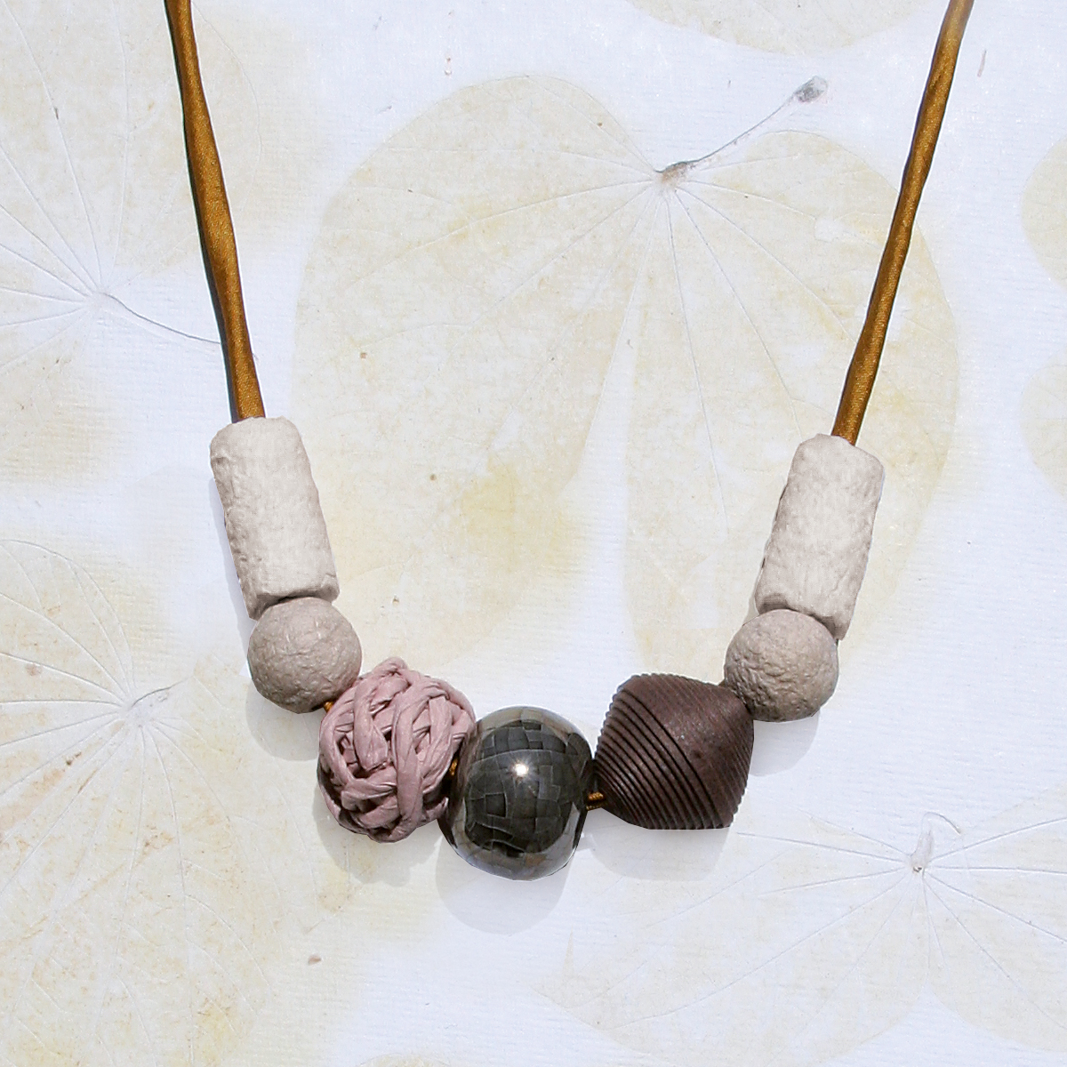 Material: verschiedene Papierperlen aus handgeschöpftem Papier, Keramikperle, Seidenband