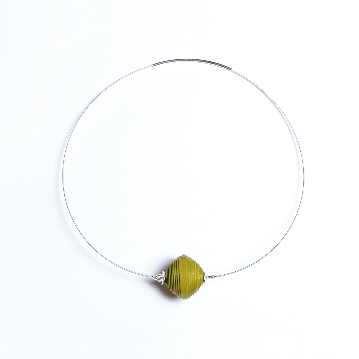 Der Halsreif hat eine runde Papierkugel (lackiert) aus stabilem handgeschöpftem Papier, die von silberfarbenen Perlen in der Mitte gehalten wird.