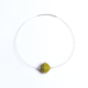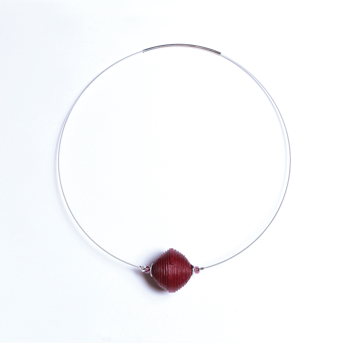Der Halsreif hat eine runde Papierkugel (lackiert) aus stabilem handgeschöpftem Papier, die von silberfarbenen Perlen in der Mitte gehalten wird.