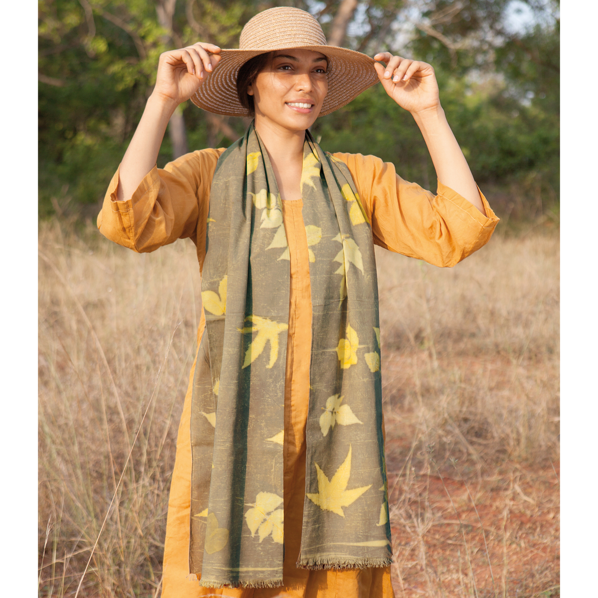 Das nachhaltige Halstuch ECO PRINT aus 100 % Bio-Baumwolle, gefärbt mit pflanzlichen Farben, ist ein wunderbares Beispiel für nachhaltige Mode, die Natur und Umwelt respektiert.